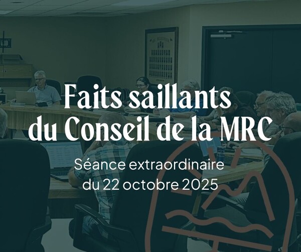 Il s'agissait de la dernière séance à laquelle siégeait l'actuel Conseil avant les élections municipales du 2 novembre. La prochaine séance ordinaire du Conseil de la MRC se tiendra le mercredi 26 novembre. Exceptionnellement, elle aura lieu le quatrième mercredi du mois, puisque l'adoption du budget en novembre implique une rencontre de travail supplémentaire pour les élus au cours du mois.