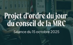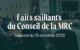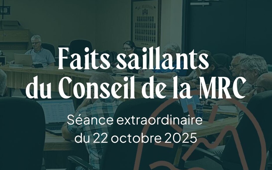 Il s'agissait de la dernière séance à laquelle siégeait l'actuel Conseil avant les élections municipales du 2 novembre. La prochaine séance ordinaire du Conseil de la MRC se tiendra le mercredi 26 novembre. Exceptionnellement, elle aura lieu le quatrième mercredi du mois, puisque l'adoption du budget en novembre implique une rencontre de travail supplémentaire pour les élus au cours du mois.