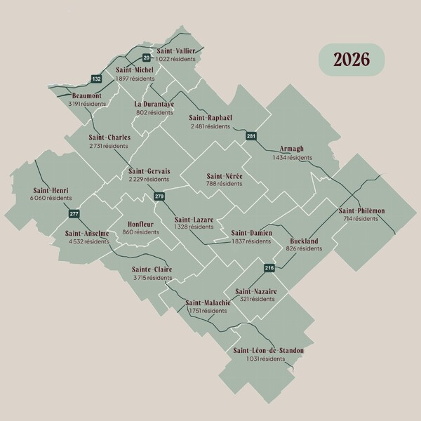 À l'échelle locale, notons que sept municipalités ont vu leur population augmenter. Parmi celles-ci, plus de la moitié ont dépassé le seuil symbolique de 1,5 %, notamment Beaumont (+56), Notre-Dame-Auxiliatrice-de-Buckland (+24), Saint-Philémon (+11) et Saint-Nérée (+20).