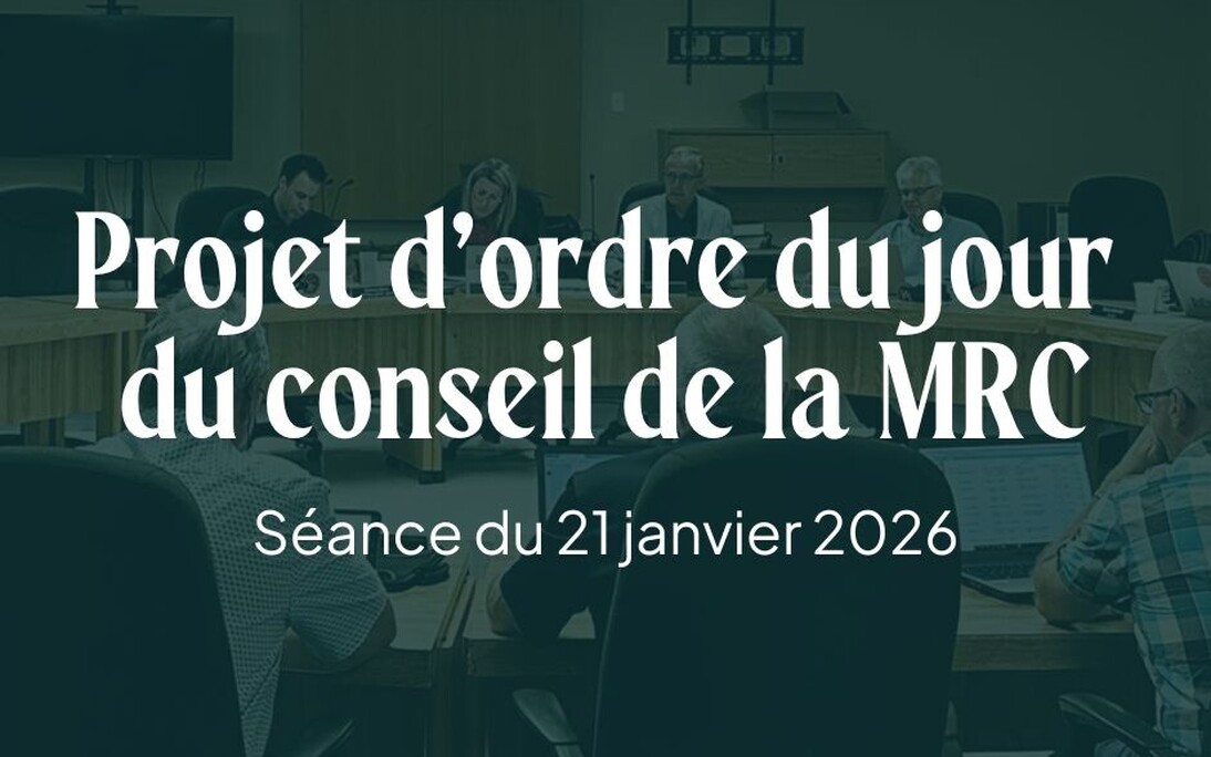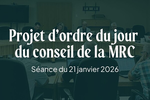 La prochaine séance du Conseil de la MRC aura lieu ce mercredi 21 janvier à 20h. Les citoyens et citoyennes souhaitant assister à la séance sont les bienvenus. Voici le projet d'ordre du jour :